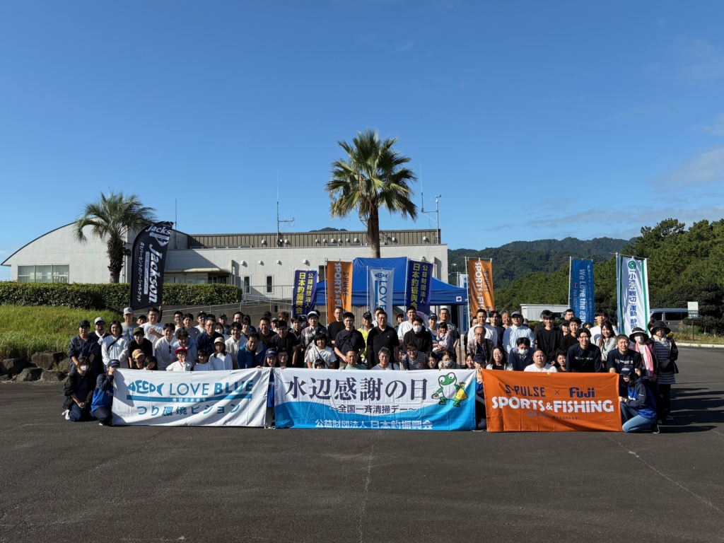 「水辺感謝の日」は、1994年(平成6年)に、公益財団法人日本釣振興会が、自然と共存できる環境づくりを目指し設けられ、環境美化活動も今年で31年目となります。当日は秋晴れのもと、92名の方々に参加をいただき、水辺の清掃活動を実施いたしました。