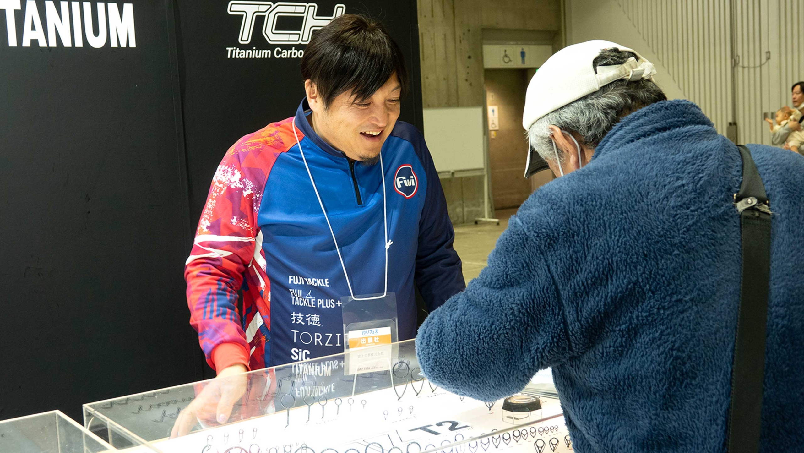 センドウ氏は「孤高の天才肌アングラー」とも称される現場主義の視点から、ロッドコンポーネントの重要性を来場者に伝えてきました。